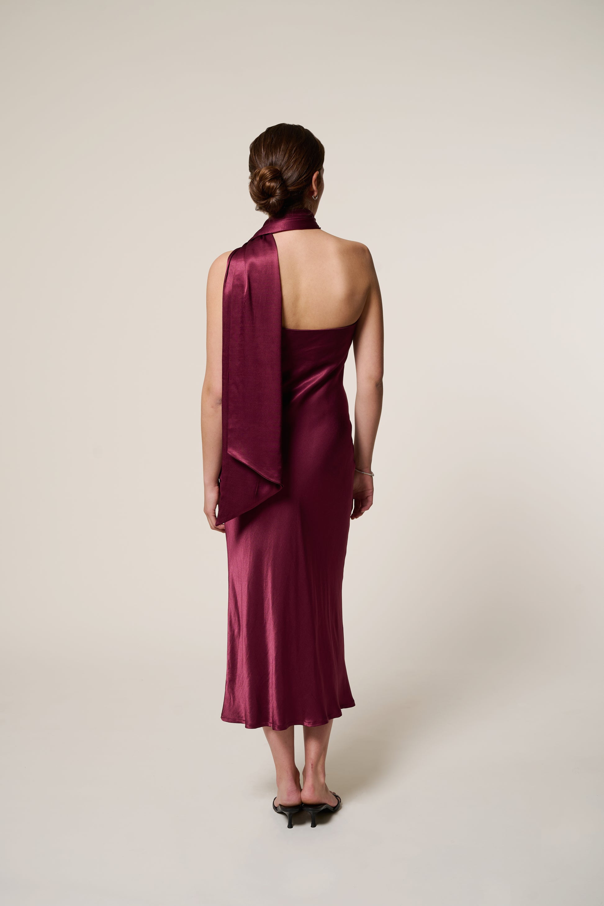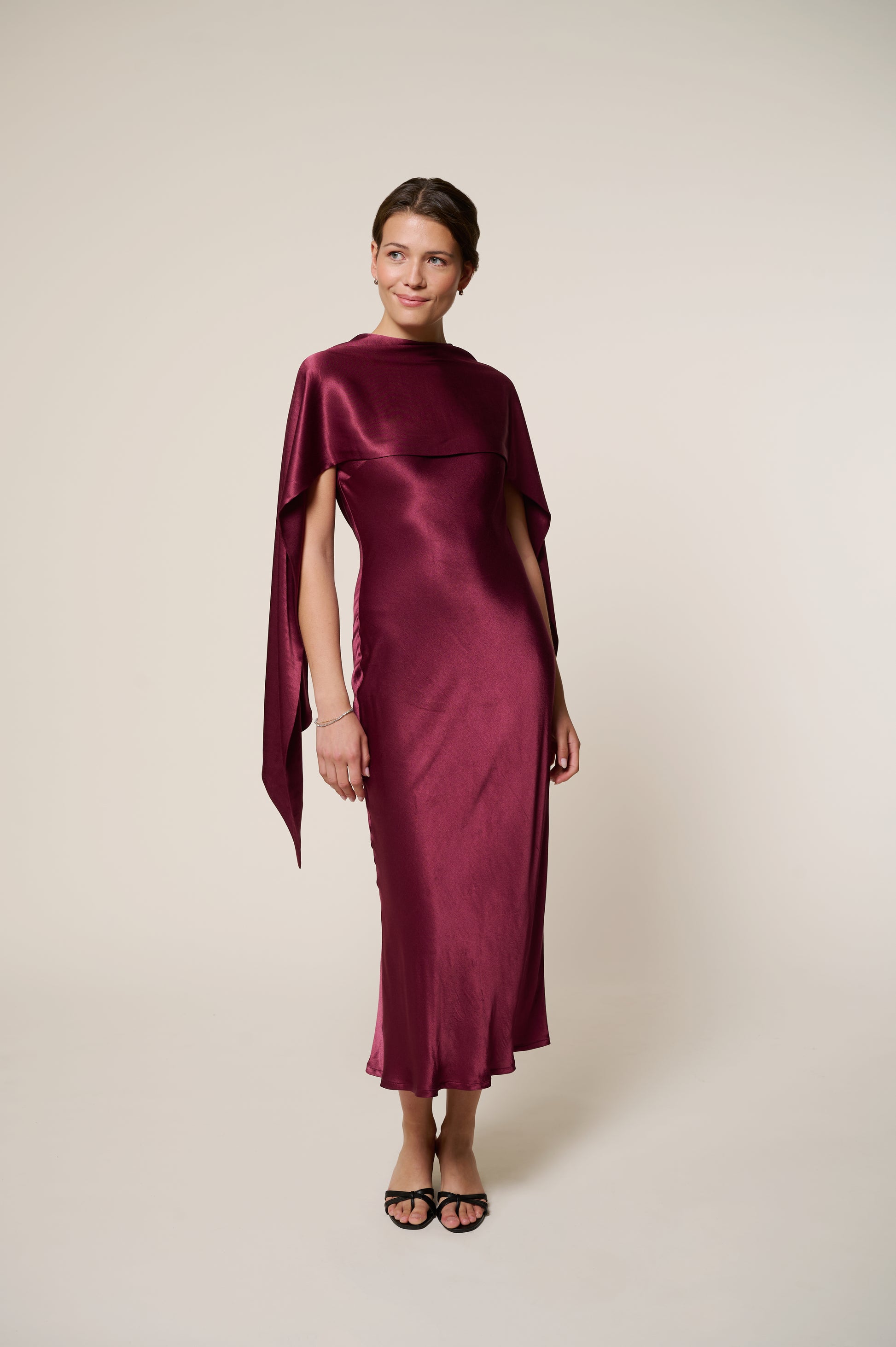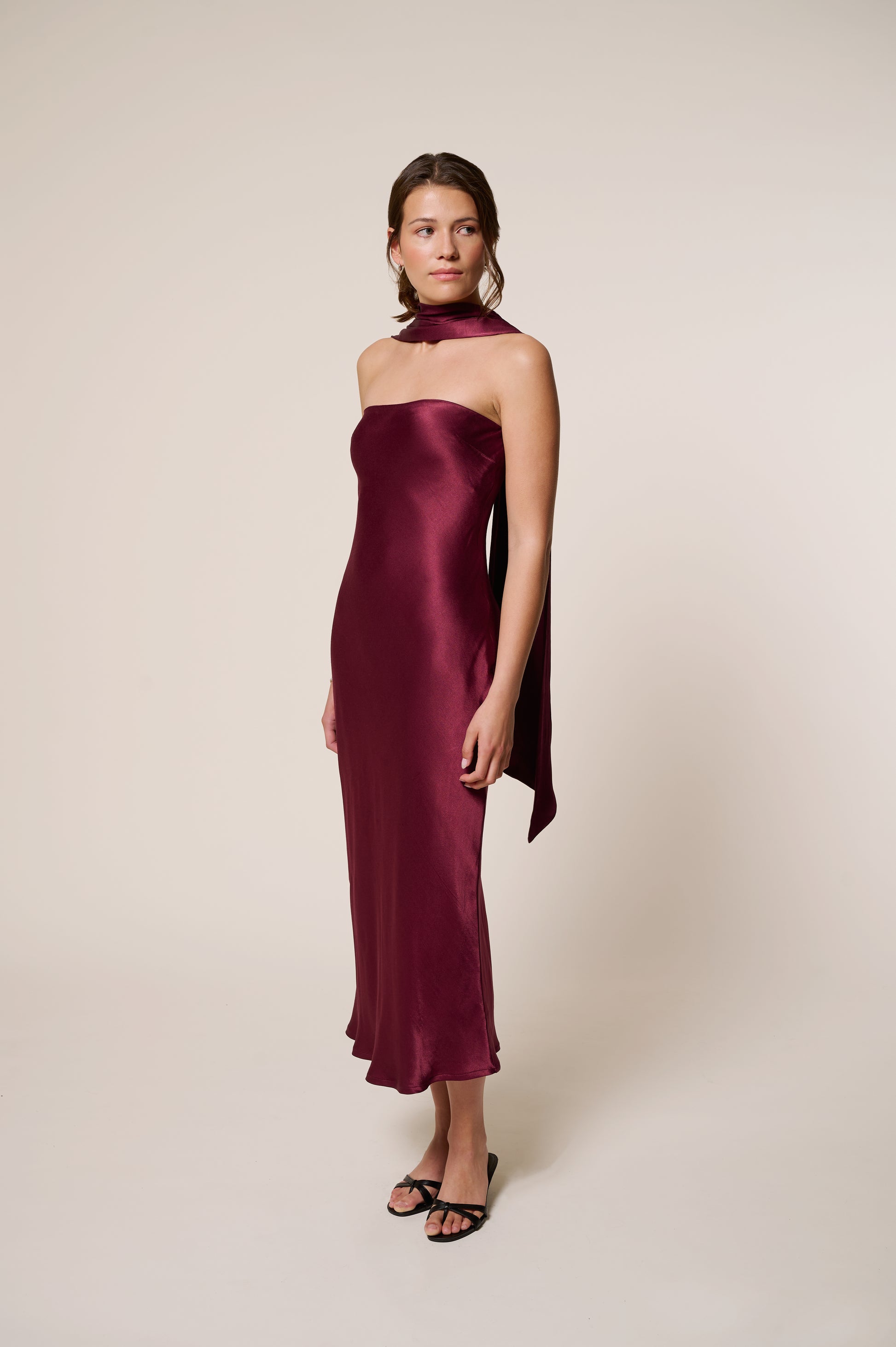 Anika er en stroppeløs satengkjole og har et mykt stoff som former seg etter kroppen og fremhever midjen. Det matchende sjalet, som er inspirert av den sørasiatiske dupattaen, tilfører et elegant element som kan styles på flere måter.