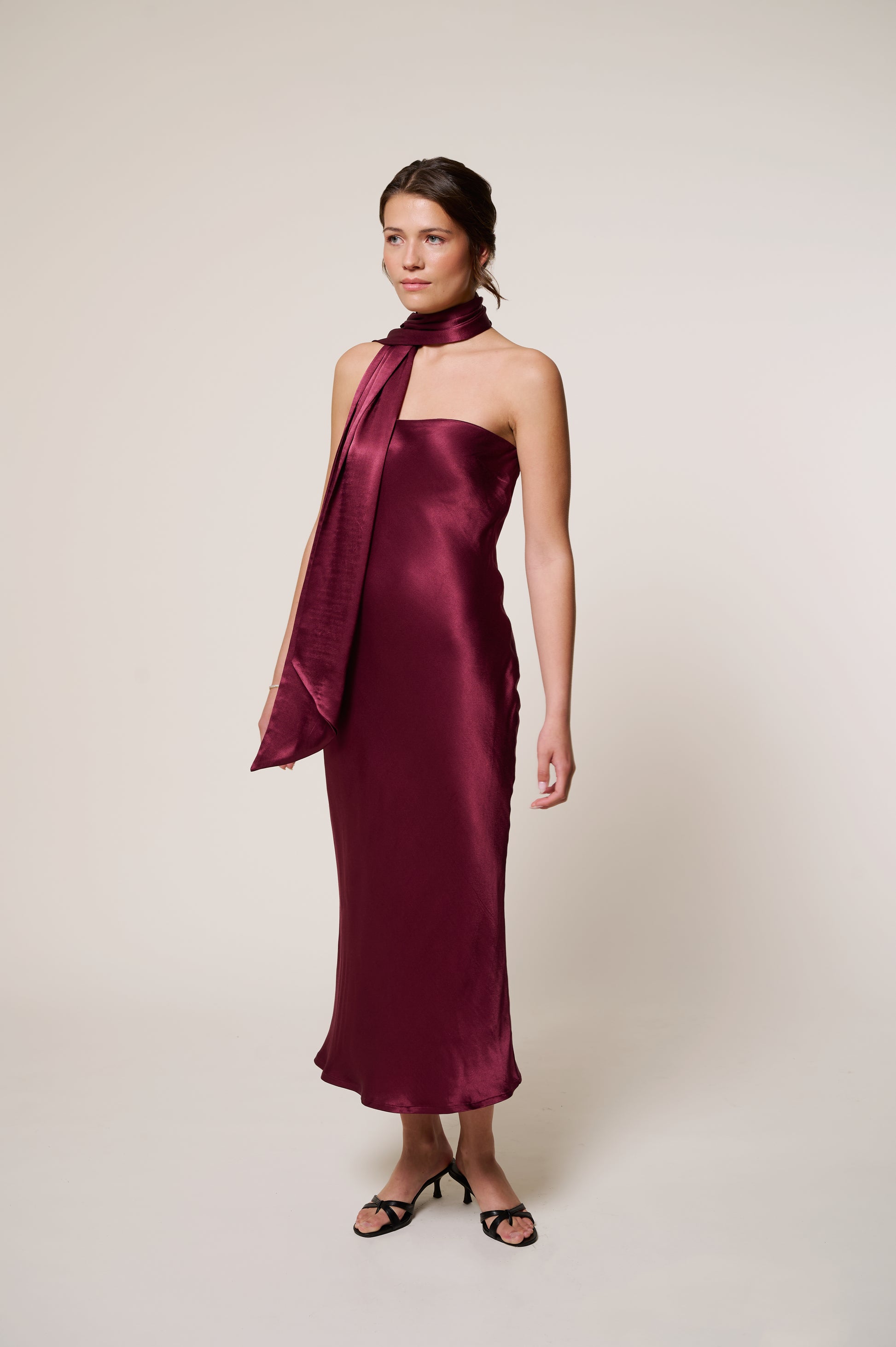 Denne satengkjolen er stroppeløs og har et elastisk, diagonalt snitt som gir noe stretch i passformen. Fremhever midjen og skaper en flatterende timeglassform. Kommer med et matchende sjal som kan brukes på mange måter.