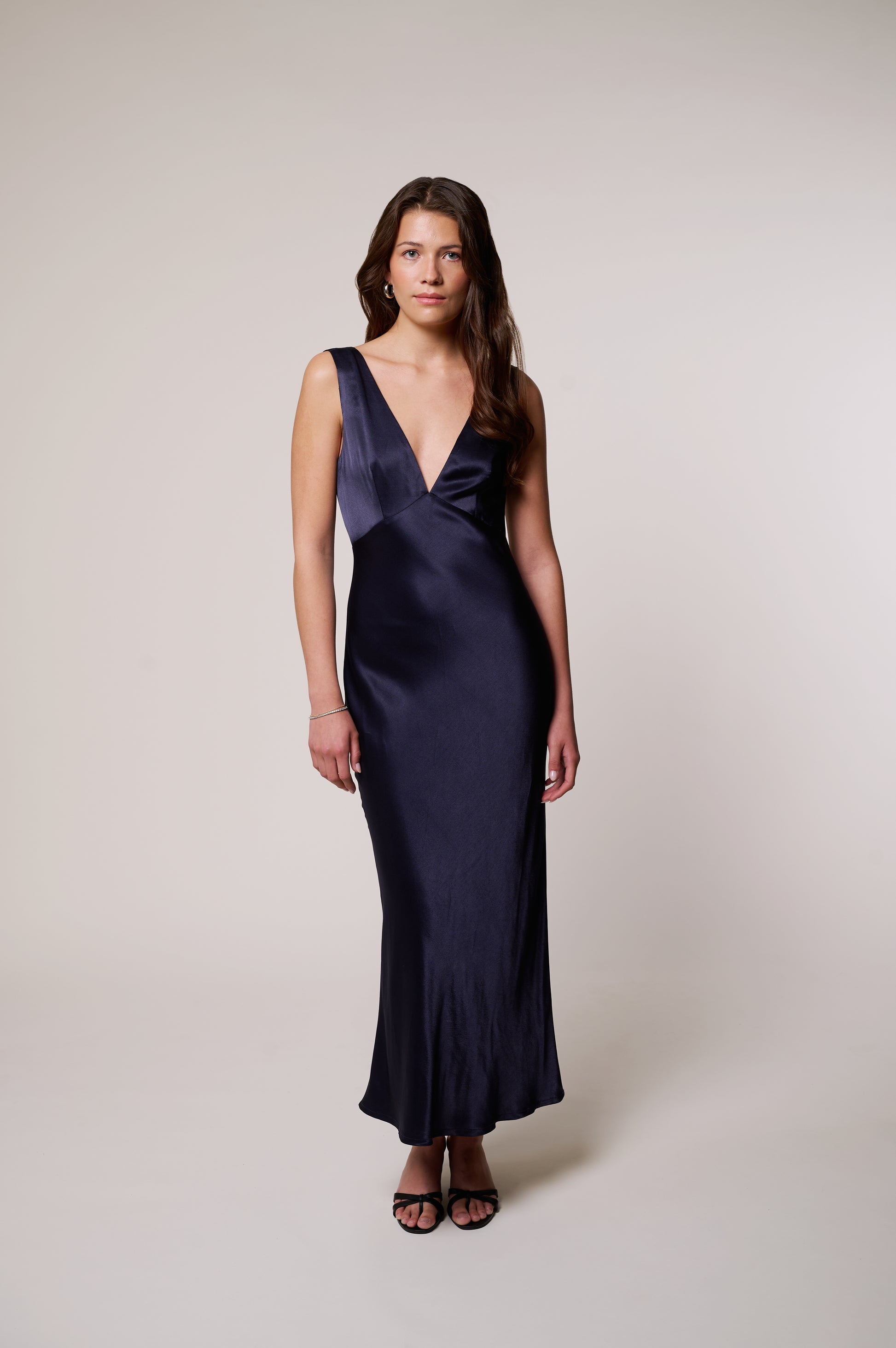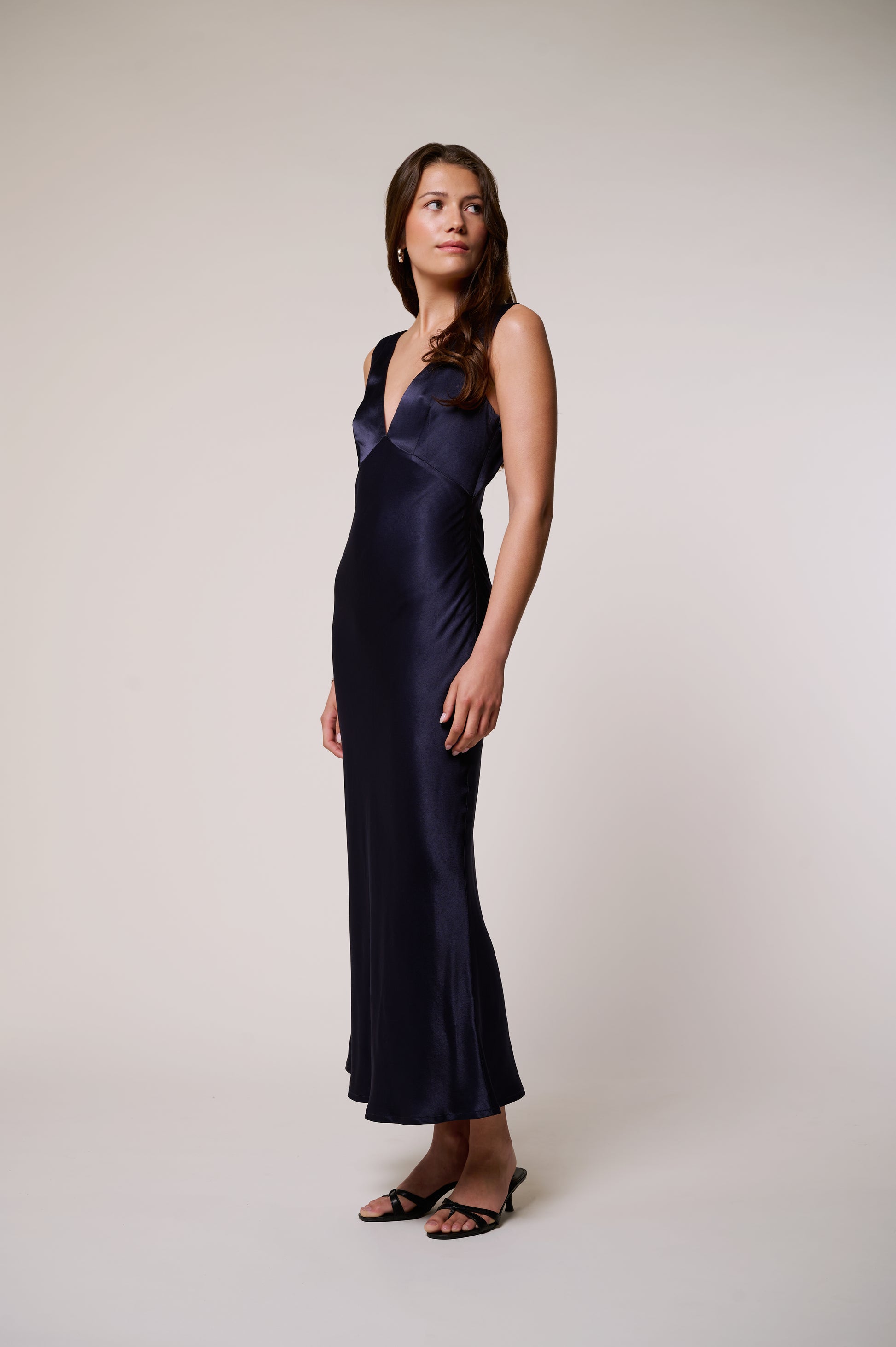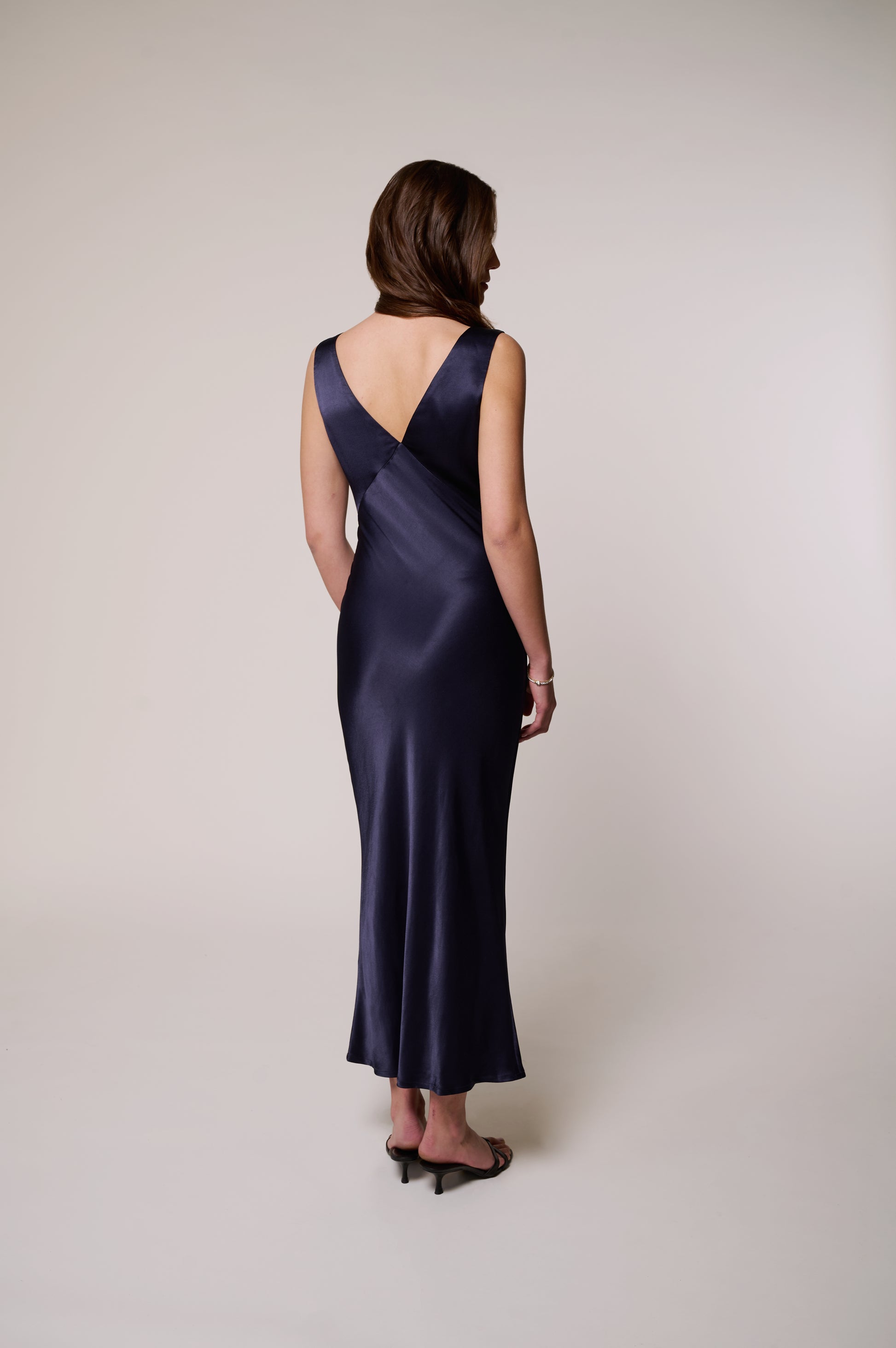 Denne kjolen har en dyp V-utringning foran og bak og en slank, kroppsnær silhuett. Den er skåret på skrå i sateng og har en naturlig stretch og fall. Kjolen er helfôret for støtte.